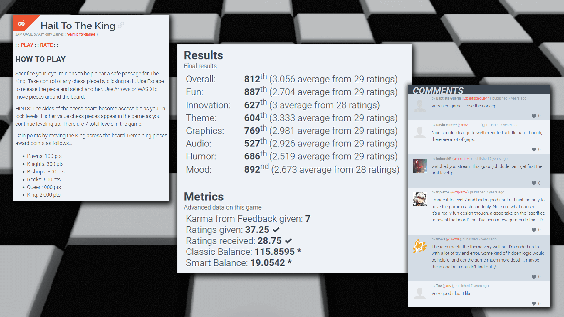 Hail To The King began as a 72-hour entry for Ludum Dare 43, one of the largest game development competitions in the world. With over 2,500 entries submitted during the event, developers were challenged to create a complete playable experience within just three days.